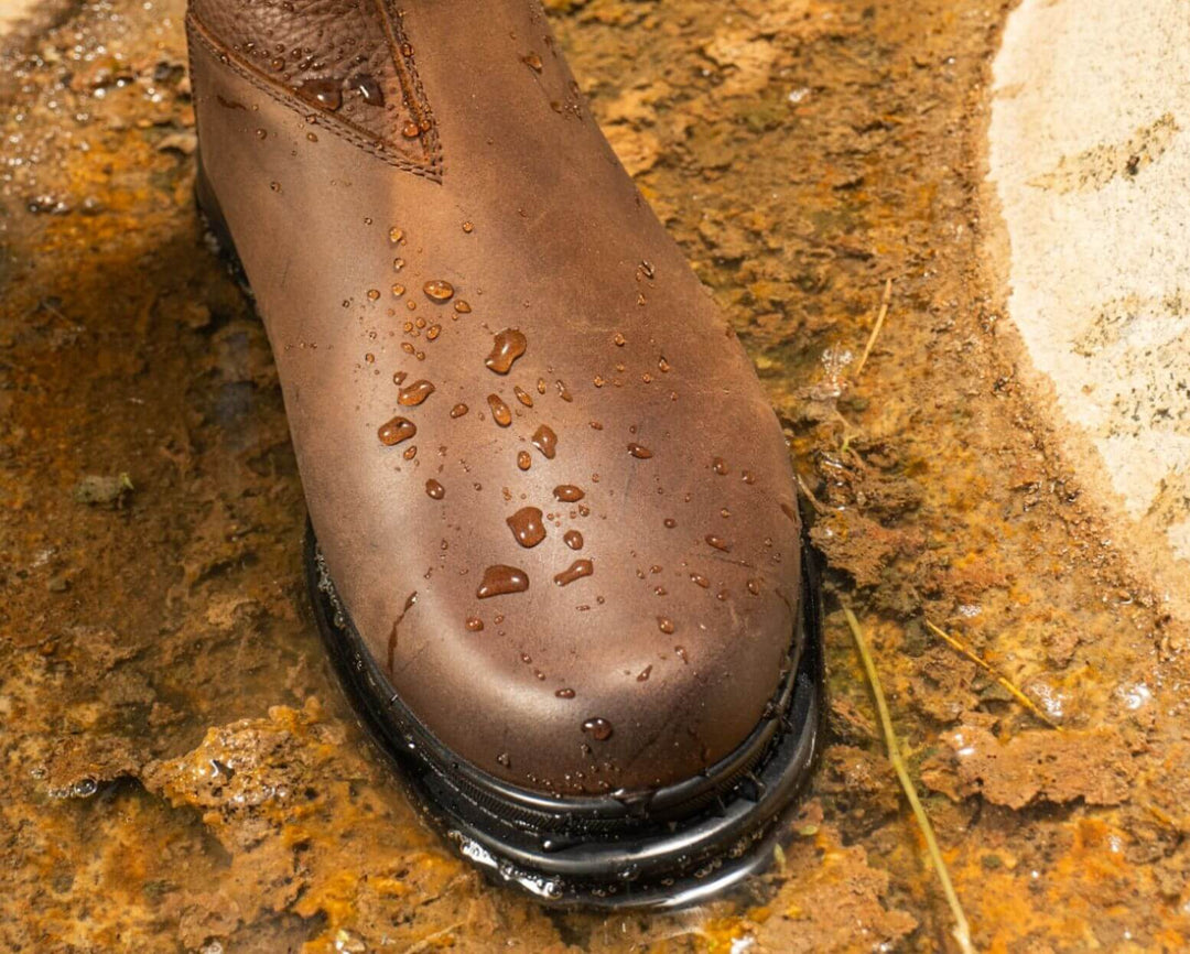 The natural leather upper has a water-repellent layer that makes it waterproof. However, the elastic sections and their seams are not waterproof.